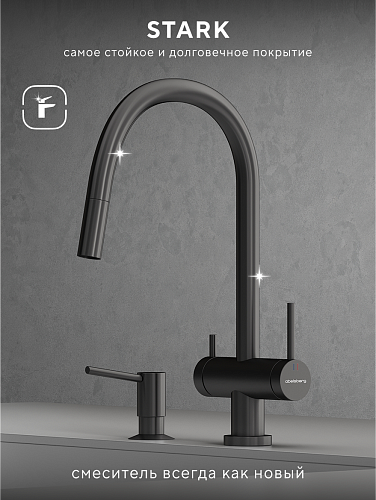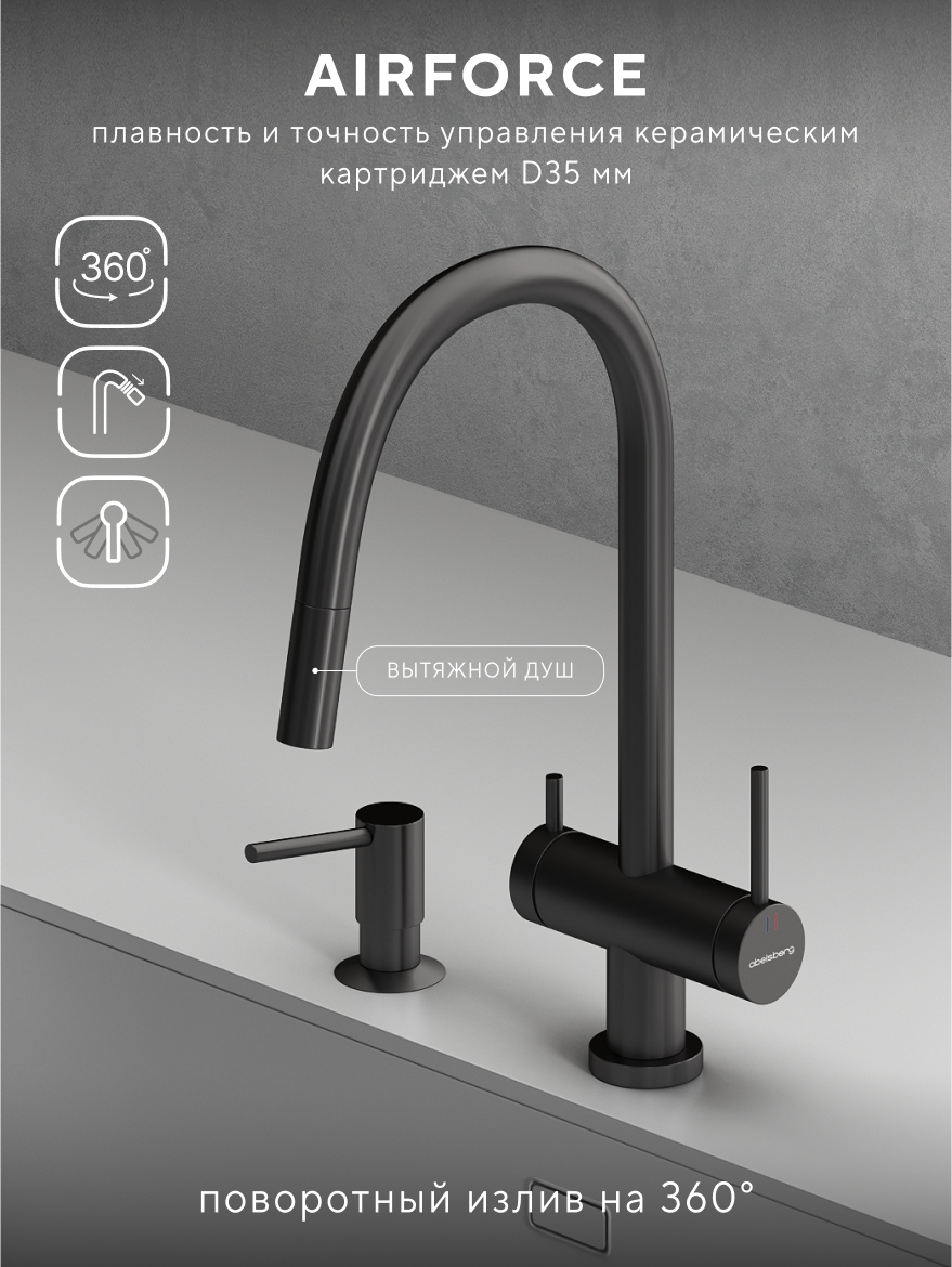 В коллекции Abelsberg Aera также представлена модель с вытяжным душем. Благодаря удлиняющемуся изливу, смеситель легко адаптируется под любые кухонные задачи — от мытья посуды до наполнения крупных ёмкостей. Abelsberg Aera с вытяжным душем – это современный функционал в классической форме.