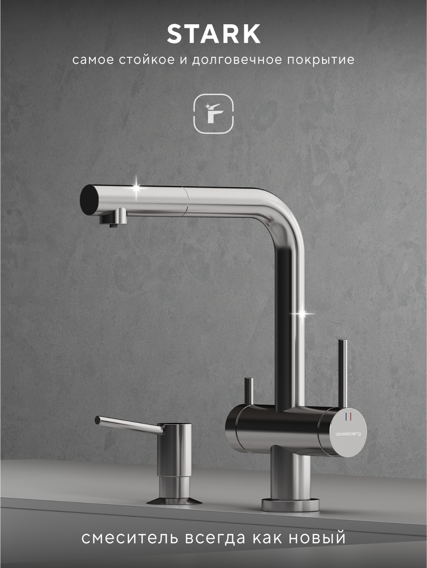 Abelsberg Pura — смеситель с вытяжным душем — расширяет привычный функционал. Гибкий шланг и плавное переключение режимов делают его удобным для работы в разных зонах мойки, а однорычажное управление и встроенный канал для питьевой воды сохраняют чистоту подачи и простоту использования. Даже при высокой функциональности Pura остаётся верной своей эстетике — сдержанной, лаконичной, чистой.