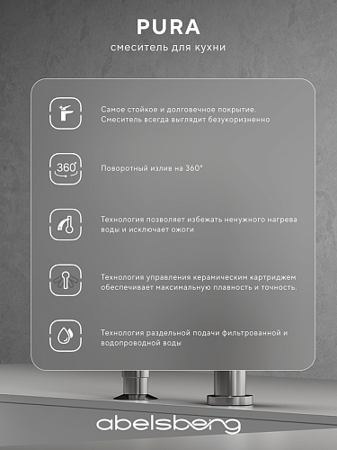 Abelsberg Pura — это коллекция, в основе которой лежит простота формы и ясность функций. Смеситель с отдельным каналом для питьевой воды предлагает экологичное решение для современной кухни: чистая вода — без смешивания, без лишних систем, без визуального шума.Продуманная геометрия, лаконичный излив и сбалансированные пропорции создают ощущение визуального порядка. Коллекция разработана для тех, кто ценит тишину в деталях и практичность без компромиссов.