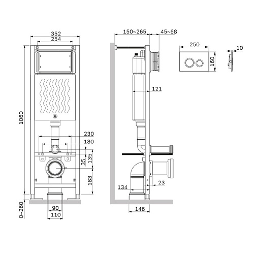 Максимально полный комплект поставки включающий все необходимые крепления патрубки звукоизолирующую прокладку. Экономия пространства благодаря узкой раме – 352 мм шириной. Подходит даже для самых малогабаритных ванных комнат. Заливной клапан с низким уровнем шума - Класс II согласно европейского стандарта EN 14124. Выдерживает нагрузку до 400 кг. Подходит для унитазов любых размеров. Высокая прочность и износостойкость. Увеличенная толщина профиля двойные прокладки слива и подачи воды. Подключение воды сзади сверху. В комплекте механическая двухрежимная клавиша из ABS пластика матовый черный ""