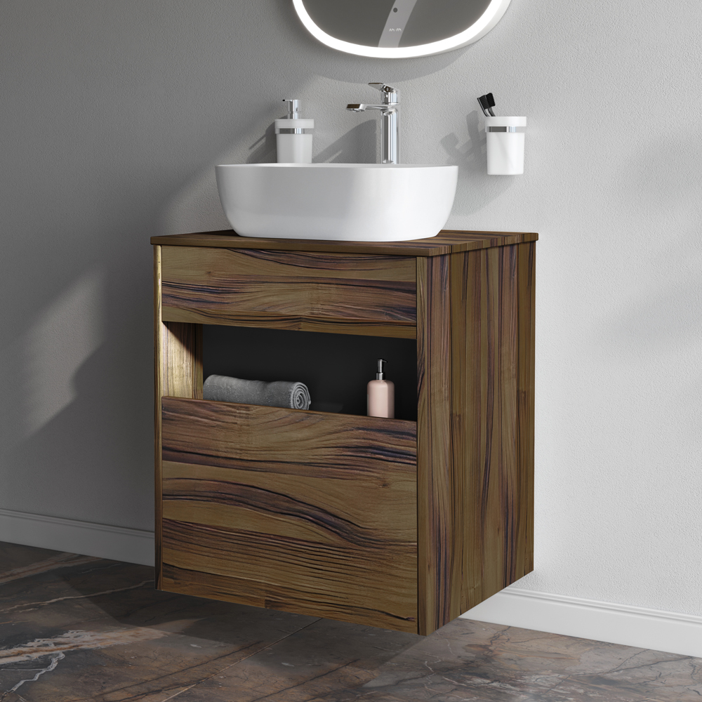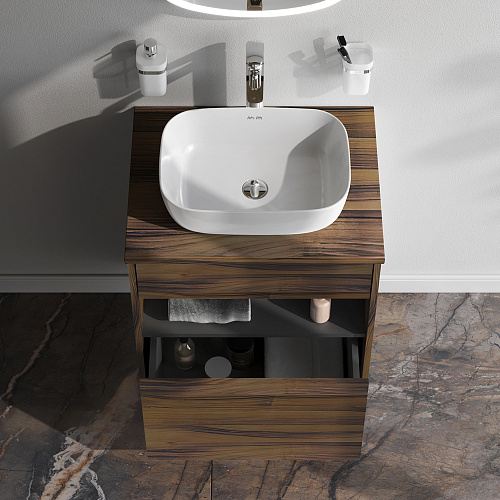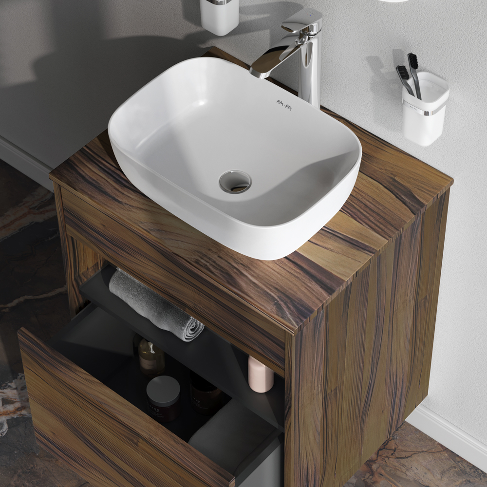 Комплект тумба со столешницей и накладной раковиной. Подвесная тумба бренда AM.PM коллекции Func отличается своей функциональностью вариативностью и мобильностью. Удобный выдвижной ящик и вместительная открытая ниша позволяют хранить все необходимые средства под рукой. Невероятно мягкое открытие и закрытие благодаря направляющим скрытого монтажа с системой soft close. Фасад и корпус тумбы выполнены из влагостойкого ЛДСП. Размер тумбы (Ш/Г/В): 608x492x700 мм. Цвет тумбы – текстурированное дерево. Тумба комплектуется столешницей соответствующего цвета и накладной раковиной. Раковина выполнена из стекловидного фарфора самого гигиеничного и влагостойкого материала. Размер раковины (Ш/Г/В): 455x330x135 мм. Преимущества и функции: Подвесная тумба помогает сэкономить место в ванной комнате визуально увеличивая пространство. Возможность подвесного и напольного монтажа (комплект ножек приобретается отдельно). Установка на удобной высоте. Оптимизация хранения вещей внутри ящиков. Грамотно расположенные скрытые коммуникации внутри тумбы. Материал раковины препятствует накоплению грязи и бактерий что облегчает чистку и поддержание гигиены. Донный клапан для раковины приобретается отдельно. Гарантийные обязательства производителя: на раковину - 25 лет на тумбу - 3 года. ""