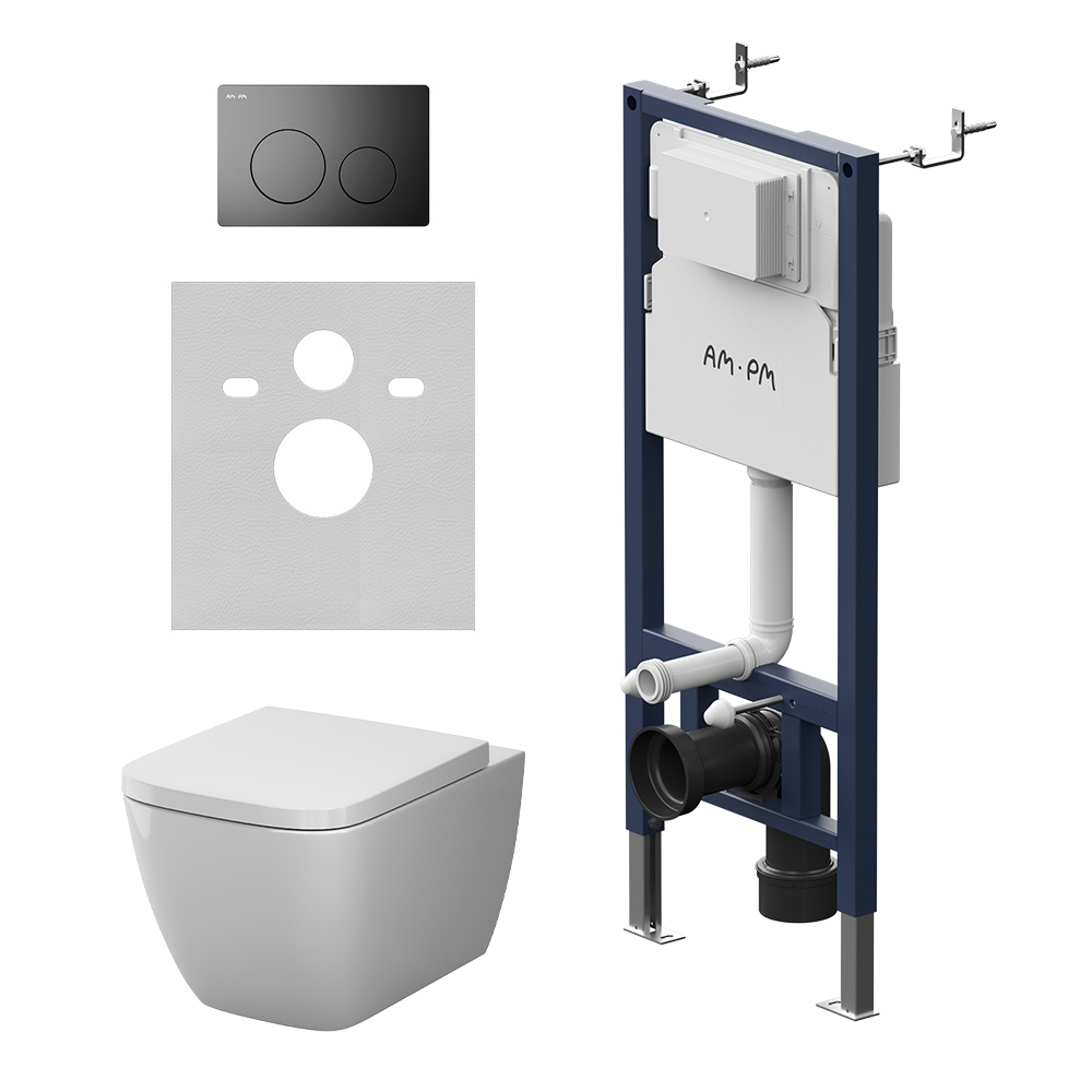 Максимально полный комплект поставки включающий все необходимые крепления патрубки звукоизолирующую прокладку. Экономия пространства благодаря узкому бачку – 120 мм глубиной. Заливной клапан с низким уровнем шума - Класс II согласно европейского стандарта EN 14124. Рама выдерживает нагрузку до 500 кг. Внутреннее сечение профиля 3 мм обеспечивает надежность и долговечность конструкции. Увеличенная толщина профиля армированный шланг подачи воды двойная прокладки слива и подачи воды. Подключение воды сзади сверху. В комплекте механическая двухрежимная клавиша из ABS пластика в цвете матовый черный. Современный дизайн и трендовая квадратная форма чаши в керамике АМ.РМ. Авторство дизайна принадлежит собственной студии AM.PM Design. AquaSpin - новая система смыва последнего поколения - более эффективное омывание чаши гигиеничность и экономия воды до 50% - в сравнении с классическими видами омывания выверенная геометрия гарантирует отсутствие брызг минимум рельефа внутри чаши обеспечивает пониженный уровень шума при смыве и дополнительную лёгкость в уборке. Дизайн смыва разработан немецким агентством Brandis. В комплекте быстросъемное сиденье из дюропласта с механизмом плавного закрывания. Материал сиденья дюропласт устойчивый к появлению царапин в сочетании с креплениями из нержавеющей стали гарантируют долговечность сиденья. ""