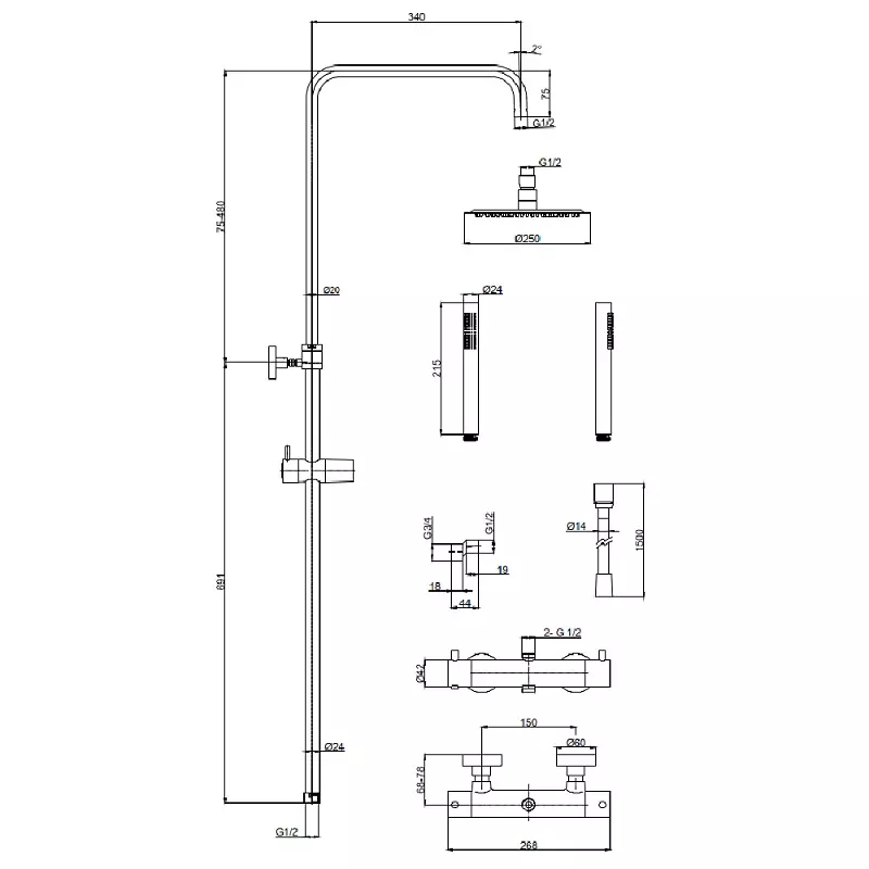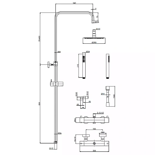 Оснащение Термостат для душа, верхний душ, ручной душ, штанга для душа, держатель для душа.