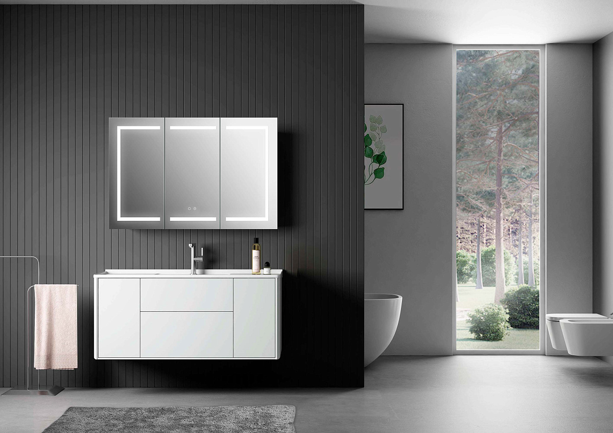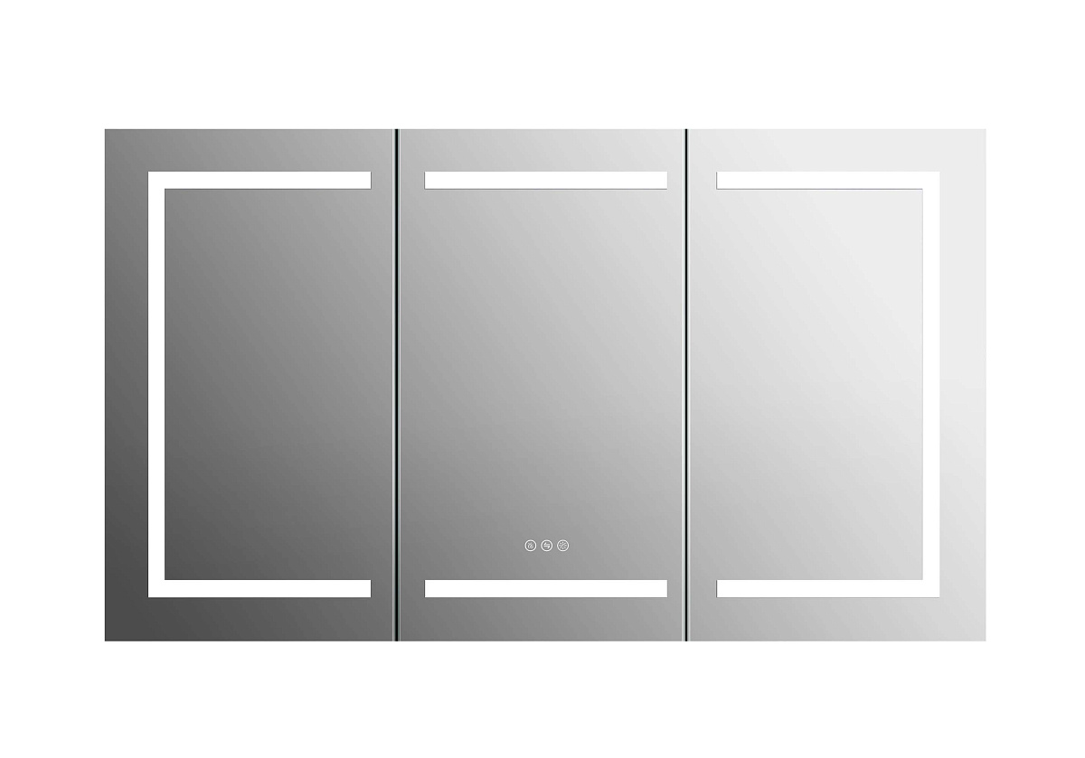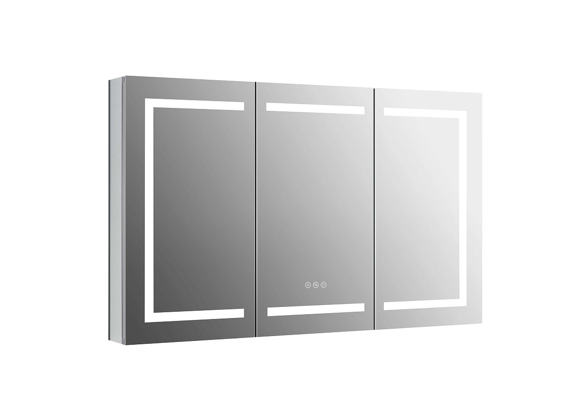 Алюминиевый зеркальный шкаф с подсветкой; Три стеклянные дверцы шириной 39,8см; Две стеклянные полки 8 мм; Круговая подсветка SMD 2835-120P, цветовая температура 2500K/6500K; Антизапотевание; 2 режима переключения света/ цвета; Сенсорное управление; Двусторонняя зеркальная дверь и зеркальные боковины; С механизмом доводчика, обеспечивающим плавное закрывание; Мебель поставляется в собранном виде; Дополнительное оснащение зеркала: подвесы; Монтаж подвесной; Гарантия: 1 год