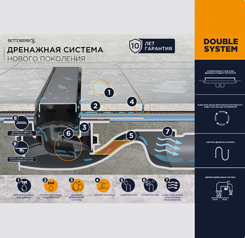 Лоток для душа с комбинированным затвором предназначен для отвода воды с пола, для душевой кабины, организации слива для душа. Корпус линейного душевого трапа сделан из ABS пластика, который не подвержен химическому воздействию, а также не поддается коррозии. Благодаря комбинированному затвору (гидрозатвор + сухой затвор) ваша ванна будет надежно защищена от неприятных запахов из канализации. Трап обладает низкой монтажной высотой (65 мм) и высокой пропускной способностью (до 100 литров), что обеспечит вам простоту в монтаже и комфорт в эксплуатации. Преимущества модели: • Комбинированный затвор; • Два дизайна в одной модели за счет двухсторонней дизайн-вставки (с одной стороны матовый хром, с другой стороны место под плитку); • Безрамочный дизайн; • Система слива конденсата из-под плитки в канализацию/сток; • Допустимая нагрузка на душевой трап 300 кг; • Легкость монтажа и простота обслуживания; • S-образный самоочищающийся сифон с покрытием Self-Cleaning, разработанный с высокой степенью функциональности, выходом 50 мм, поворотный на 360°; • Возможность регулировки высоты и наклона трапа за счет опор, входящих в комплект. Комплектация Душевой трап; S-образные сифон; Опоры для регулировчки высоты; Переходник с уплотнительной резинкой; Грязеулоавливающая сеточка; Сухой затвор; Дизайн вставка; Набор крепежей; Гидроизоляционная лента; Инструкция по монтажу; Гарантийный талон.