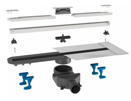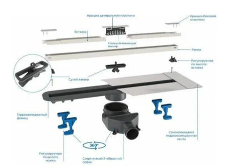Оснащение 1. Душевой трап – 1 шт. 2. S-образные сифон3. Опоры для регулировчки высоты4. Переходник с уплотнительной резинкой5. Центральная заглушка с грязеулавлвающей сеточкой6. Боковые заглушки с логотипом7. Сухой затвор8. Двойная вставка9. Держатели дизайн-вставки10. Устройство для снятия решетки – 1 шт. 11. Набор крепежей – 1 компл. 12. Гидроизоляционная лента – 1 компл. 13. Рамка – 1 шт. 14. Инструкция по монтажу – 1 шт. 15. Гарантийный талон – 1 шт. 16. Упаковка – 1 шт.