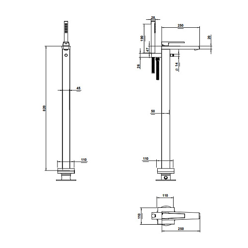 Bongio 01534OR0DEU Bongio Stelth Смеситель для ванны напольный 820 мм, с ручным душем и дивертером, (необх.внутр.часть 09744) цвет золото