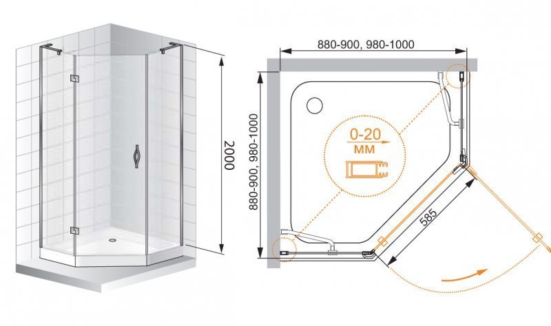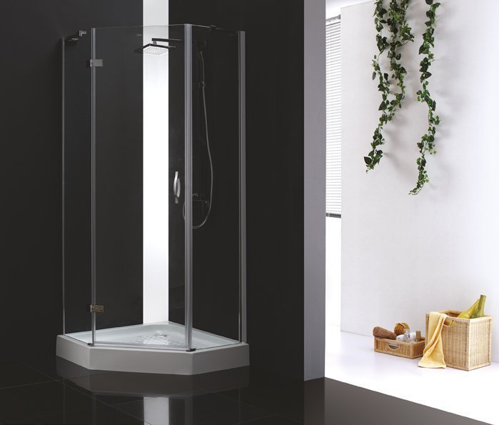 Душевой уголок, пятиугольный. Тип дверей: одна распашная дверь. Стекло: 6 мм. Исполнение: хром. Поддон: Тип Р или барьер Тип B. Поддон и барьер приобретаются отдельно. Особенности: * улучшенная герметичность за счёт петли с функцией подъема двери, * скрытые крепежные элементы петель, * увеличенная Высота, * хромированный магнитный уплотнитель дверей.