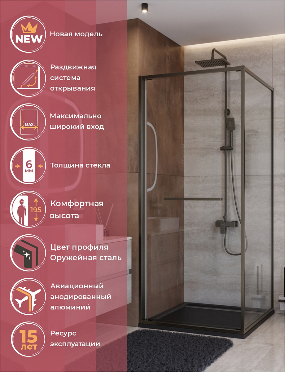 ● Коллекция включает шесть решений под любую задачу: квадратную (A-FS-1, A-FS-11), прямоугольную (AH-FS-1, AH-FS-11) и дверь в нишу (BF-FS-1, BF-FS-11). Высота 1950 мм и популярные размеры упрощают интеграцию в любое пространство.