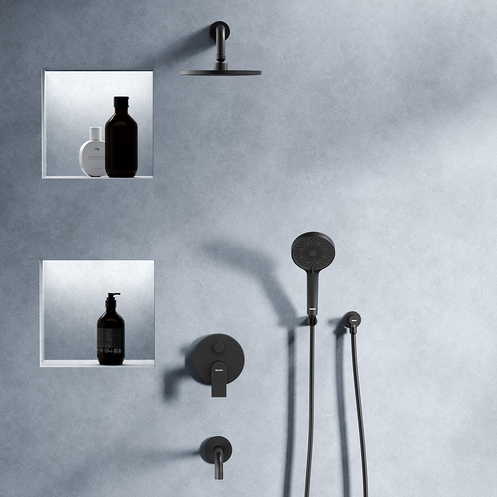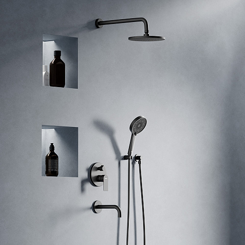 Встраиваемая душевая система из коллекции Apollo станет центром притяжения ванной комнаты. Тонкие линии и четкие грани в сочетании с массивными формами создают исключительную коллаборацию стиля. Теперь и в матовом черном цвете. Полностью скрытые коммуникации: практичное и современное решение которое соответствует минималистичному скандинавскому стилю. Ничего лишнего. Увеличенные душевые лейки и 3 режима ручного душа позволят полностью насладиться душевыми процедурами - взбодриться утром и расслабится вечером. Верхний душ диаметром 250 мм ручной душ диаметром 125 мм. Керамический картридж Light Flow обеспечивает плавное управление ручкой смесителя и оптимальную регулировку температуры и мощности потока. Инновационное PVD-покрытие гарантирует чрезвычайную прочность смесителя. Матово-черная поверхность не выцветает с годами и устойчива к механическим повреждениям загрязнениям и отпечаткам пальцев. ""