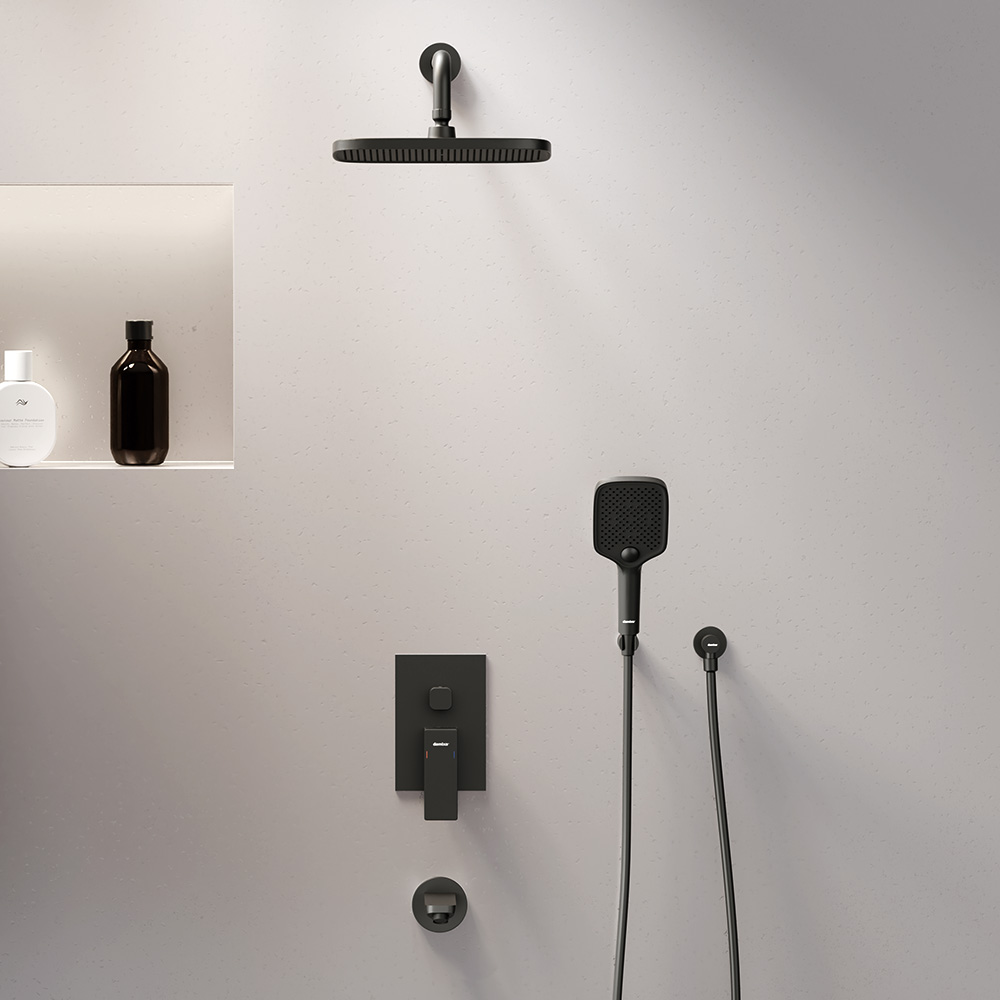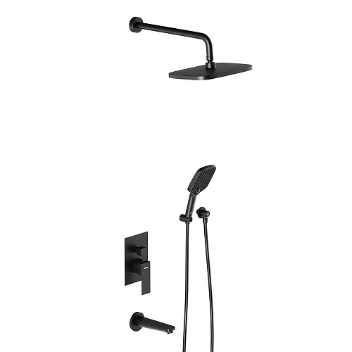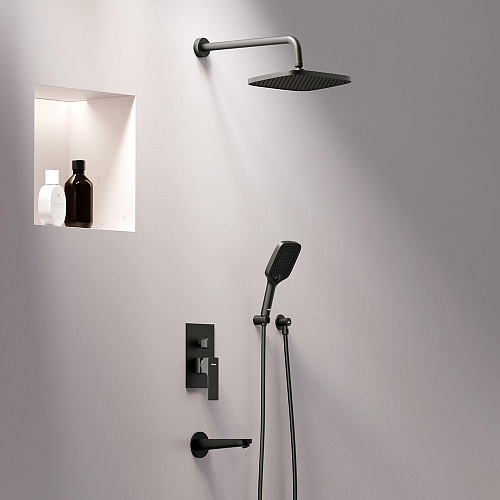Душевая система Gala обладает мягкими геометричными формами которые идеально впишутся в современную ванную комнату. Простая и минималистичная на первый взгляд она чрезвычайно функциональна и удовлетворит даже самого искушенного пользователя. А полностью скрытые коммуникации освободят дополнительное пространство для реализации самых смелых дизайнерских идей. Настоящее SPA прямо у вас дома: увеличенный размер тропической лейки с регулируемым углом наклона и 3 режима ручного душа сделают ваши ежедневные ритуалы незабываемыми. Простота и минимализм во всем: переключайте потоки воды между ручной тропической лейкой и изливом плавным поворотом дивертора. Инновационное PVD-покрытие гарантирует чрезвычайную прочность душевой системы. Матово-черная поверхность не выцветает с годами и устойчива к механическим повреждениям загрязнениям и отпечаткам пальцев. ""