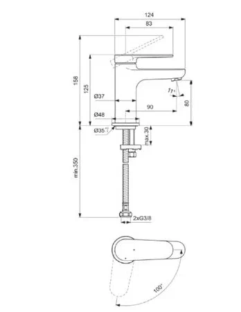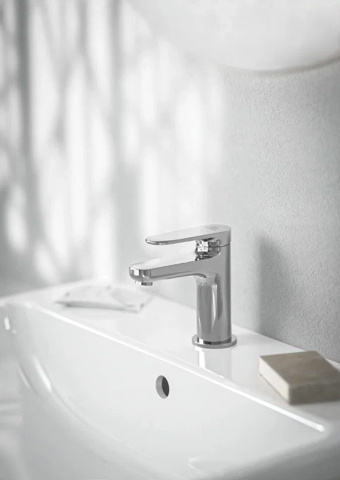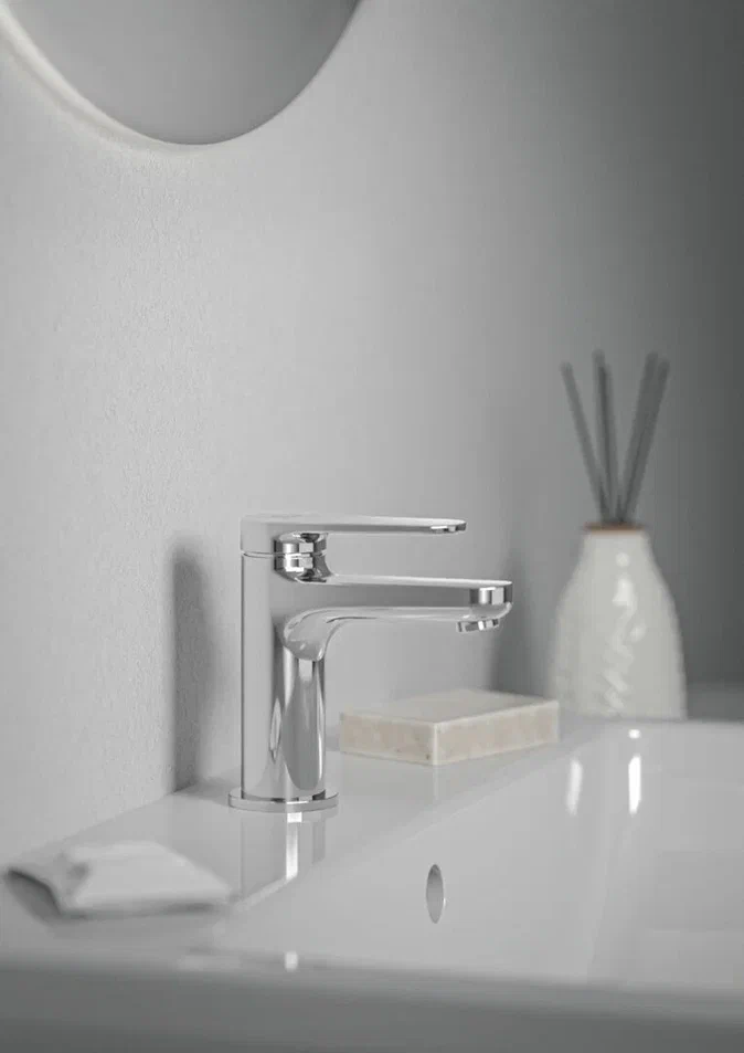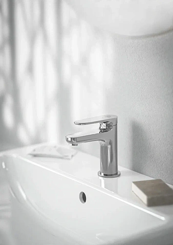 CERAFINE O NUOVO Смеситель для раковины H80, керамический картридж FirmaFlow 28 мм с функцией HWTC (ограничение максимальной температуры горячей воды), металлическая рукоятка с индикаторами горячей / холодной воды, аэратор 3,8 л/мин, система монтажа EASY-FIX (облегченный монтаж), гибкая подводка G3/8", технология Blue Start. Упаковка без пластика.