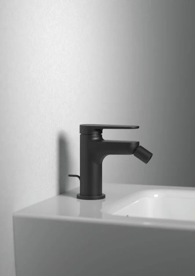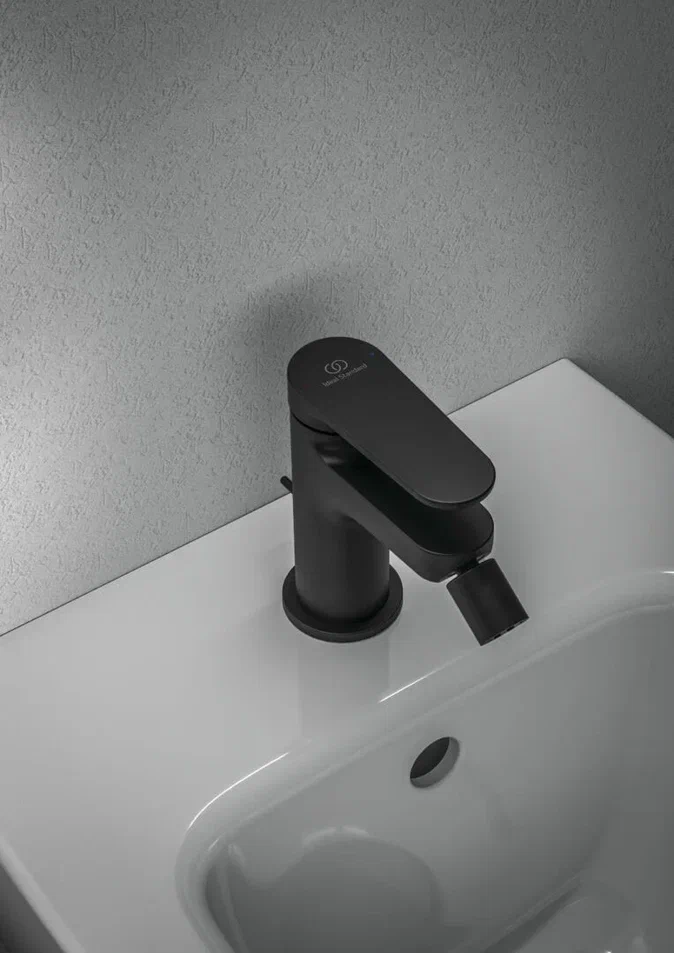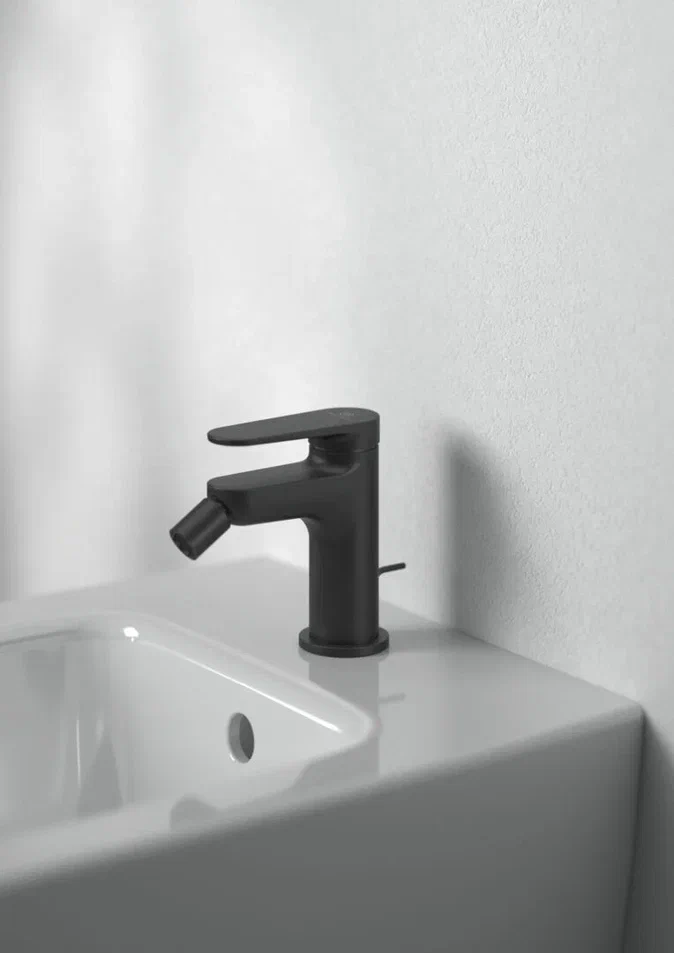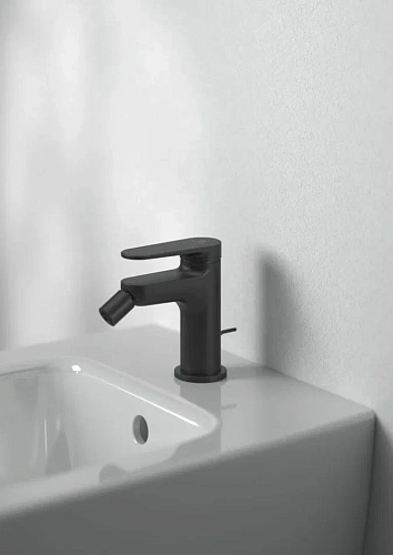 CERAFINE O NUOVO Однорукоятковый смеситель для биде, керамический картридж FirmaFlow 28 мм с функцией HWTC (ограничение максимальной температуры горячей воды), гибкая подводка G3/8", система монтажа EASY-FIX (облегченный монтаж), аэратор на шаровом шарнире (поворотный) с ограничением потока на 3,8 л/мин., металлическая рукоятка с индикаторами горячей / холодной воды, металлический донный клапан. Упаковка без пластика.