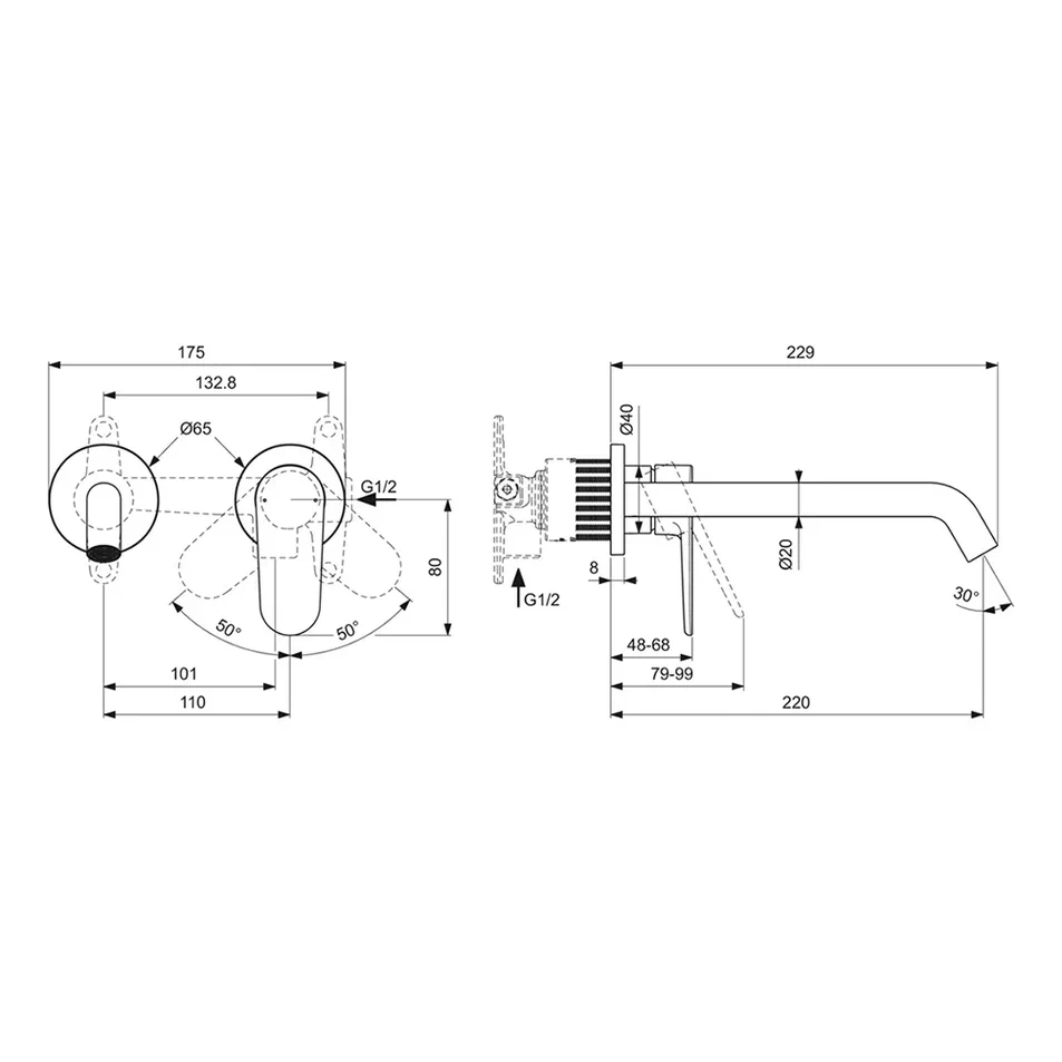 CERAFINE O NUOVO Настенный смеситель для раковины, для монтажа со встраиваемым комплектом A1313NU (заказывается дополнительно), трубчатый излив 220 мм, аэратор 3,8 л/мин, картридж 28 мм FirmaFlow с функцией HWTC, металлическая рукоятка с индикаторами горячей / холодной воды