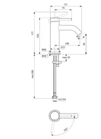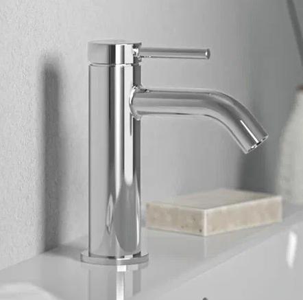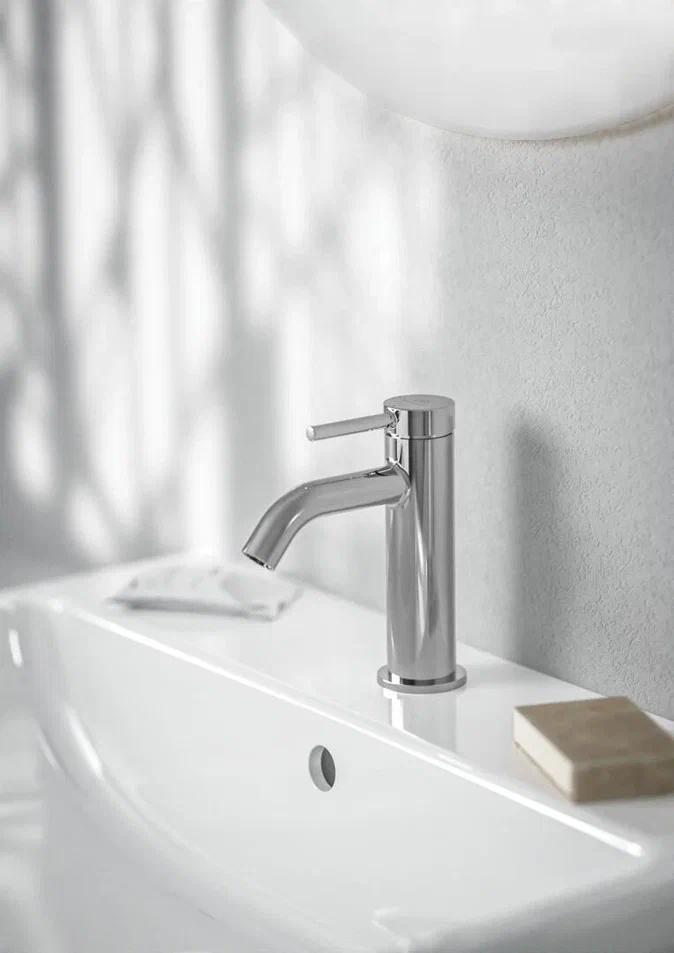 CERALINE NUOVO Смеситель для раковины H85, керамический картридж FirmaFlow 28 мм с функцией HWTC (ограничение максимальной температуры горячей воды), металлическая рукоятка с индикаторами горячей / холодной воды, аэратор 3,8 л/мин, система монтажа EASY-FIX (облегченный монтаж), гибкая подводка G3/8", технология Blue Start. Упаковка без пластика.