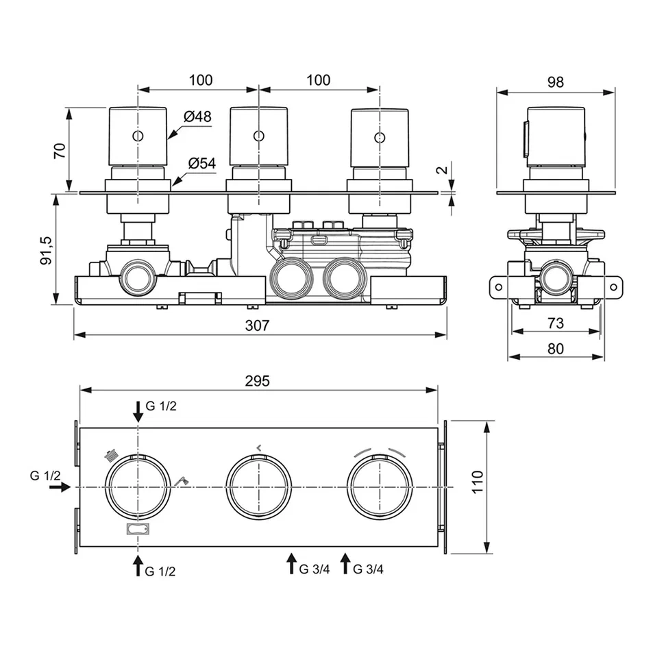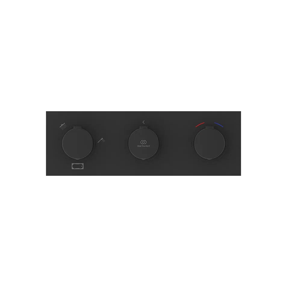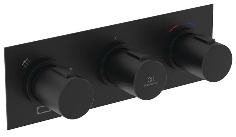 CERATHERM C100 Встраиваемый термостатический смеситель для ванны/душа на 3 выхода (верхний душ, ручной душ, излив для ванны), полный комплект (внешняя + встраиваемая части). Прямоугольная металлическая накладка с пиктограммами, металлические рукоятки. Обратные клапаны на входах. Термостатический картридж PreciTherm®, ограничение максимальной температуры горячей воды. Рукоятка с ограничителем температуры воды (40?C). Поворот рукоятки переключателя - 240° (не следует принудительно выходить за пределы этого диапазона). Горизонтальное или вертикальное размещение на стене. При горизонтальном монтаже переключатель должен быть слева, при вертикальном монтаже переключатель должен быть вверху.
