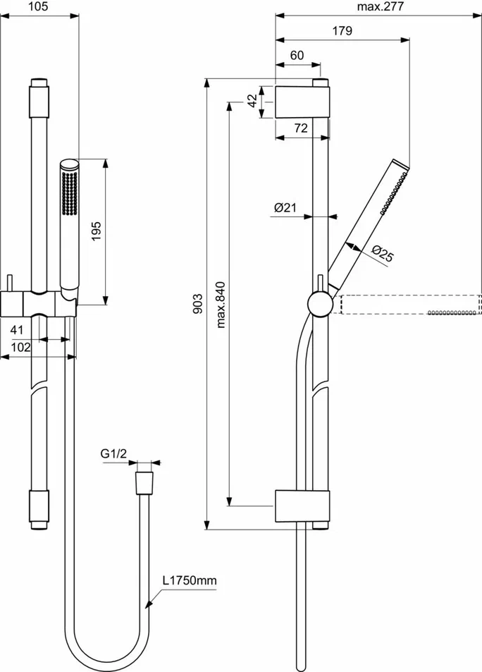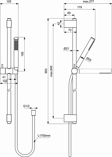 IDEALRAIN Душевой гарнитур со штангой 90 см, 1-функциональная лейка Stick, ограничение потока 8 л/мин., шланг 1750 мм с силиконовым покрытием IDEALFLEX®, штанга 90 см с регулируемыми кронштейнами, металлический слайдер, фиксатор высоты, регулировка наклона лейки
