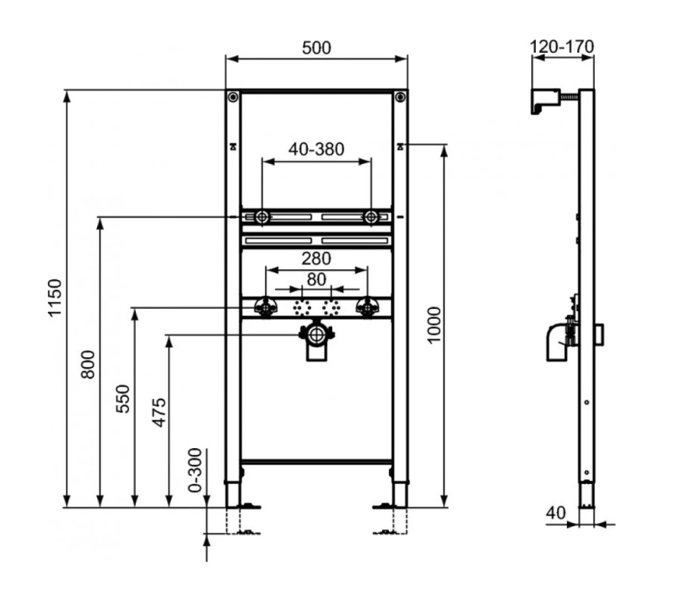 PROSYS Рама для монтажа подвесной раковины (с отверстием под смеситель), для монтажа перед капитальной стеной или между двумя гипсокартонными стенами. Рама тестирована нагрузкой 150 кг; устойчива к коррозии и царапинам. Легкая и быстрая установка при помощи системы EasyFix system. Регулируемая высота от 0 до 300 мм. Минимальная толщина 120 мм. Регулируемые монтажные пластины. Аксессуары в комплекте: крепежи для раковины, крепежи для рамы, сливной патрубок, подключение для воды G ?, 2 шт.