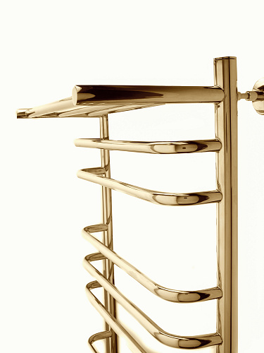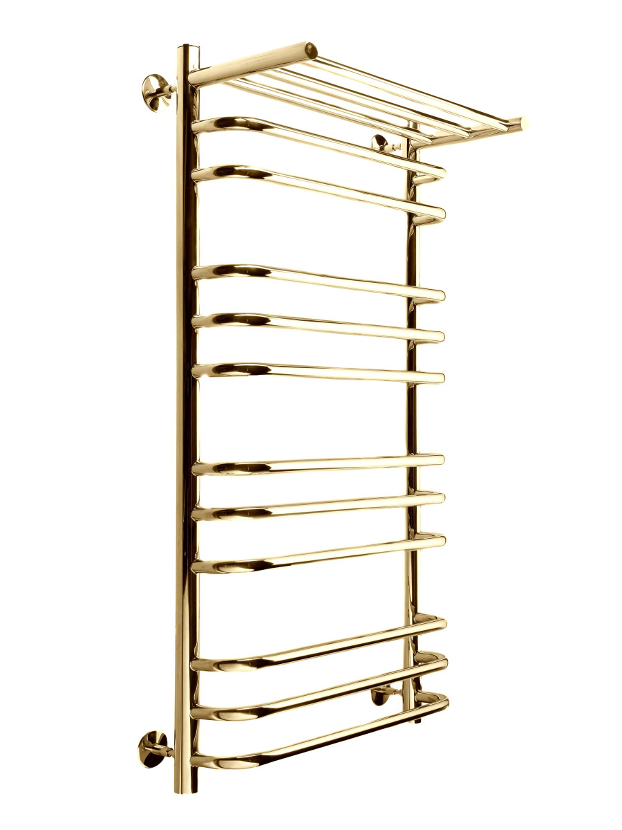 Полотенцесушитель водяной INDIGO Brace с полкой в размере 1000х500 (ВхШ) обеспечивает быстрый и равномерный нагрев полотенец. За счёт своей формы, этот полотенцесушитель лесенка считается одним из самых вместительных. Выгнутые скобообразные перекладины не только придают полотенцесушителю стильный внешний вид, но и обеспечивают удобное размещение большого количества полотенец и белья. Наличие полочки создаёт ещё больше пространства для размещения банных пренадлежностей. Модель в золотом цвете станет элегантным дополнением интерьера вашей ванной комнаты. Полотенцесушитель лесенка, выполненный из нержавеющей стали, обеспечит эффективный обогрев и прослужит долгие годы. Нержавеющая сталь гарантирует долговечность и устойчивость к коррозии. В комплектацию входит изделие, гарантийный талон, держатель 2 шт., колпачок декоративный 2 шт., кран Маевского 2 шт., муфта с поворотным кольцом 2 шт., уплотнительное кольцо 2 шт., гайка накидная 2 шт, угловые фитинги. Вся продукция ТМ INDIGO застрахована и имеет гарантию.