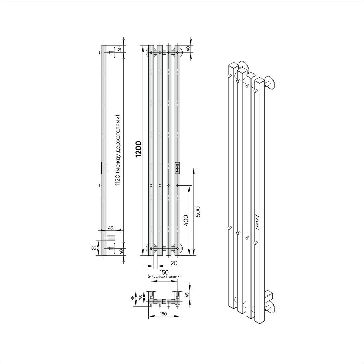Оснащение Полотенцесушитель электрический - 1 шт, провод для подключения - 1 шт, паспорт изделия - 1 шт, комплект для монтажа - 1 шт, держатель телескопический - 4 шт.