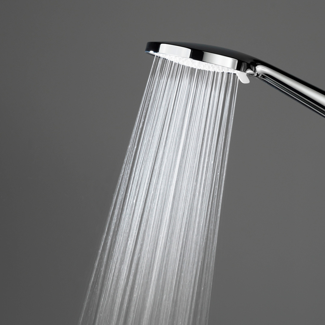 Верхний душ и ручная лейка имеют круглую форму. Стойка выполнена из нержавеющей стали, круглая в сечении. У ручной лейки предусмотрены три режима потока. Регулировка высоты при установке — 855-1255 мм.