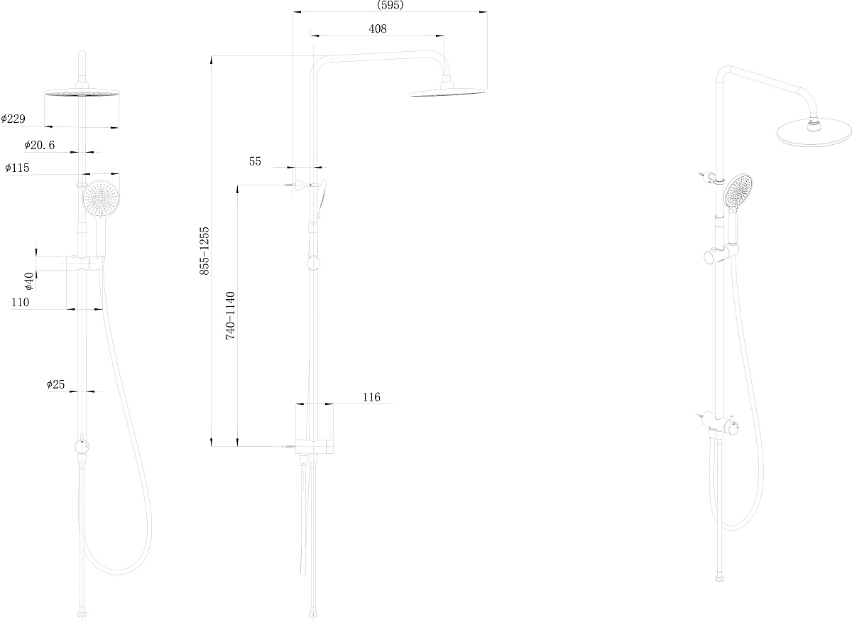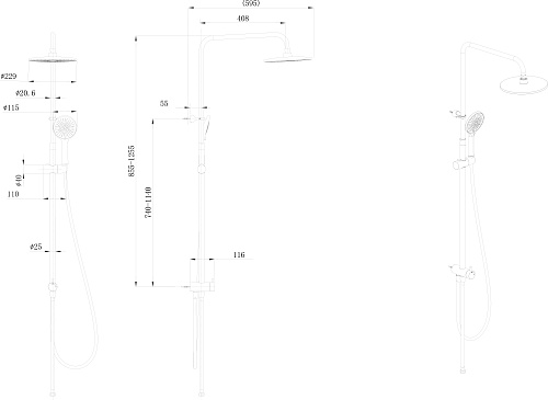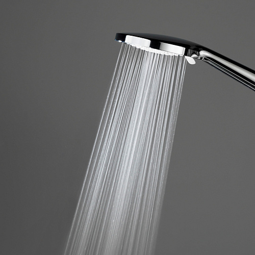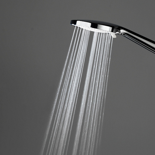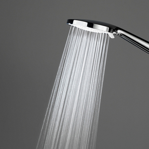 Верхний душ и ручная лейка имеют круглую форму. Стойка выполнена из нержавеющей стали, круглая в сечении. У ручной лейки предусмотрены три режима потока. Регулировка высоты при установке — 855-1255 мм.
