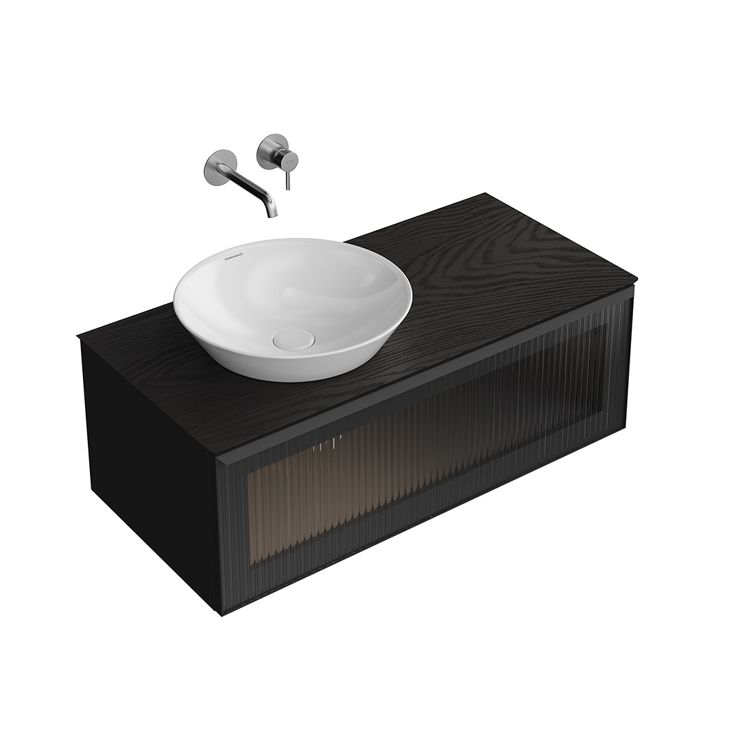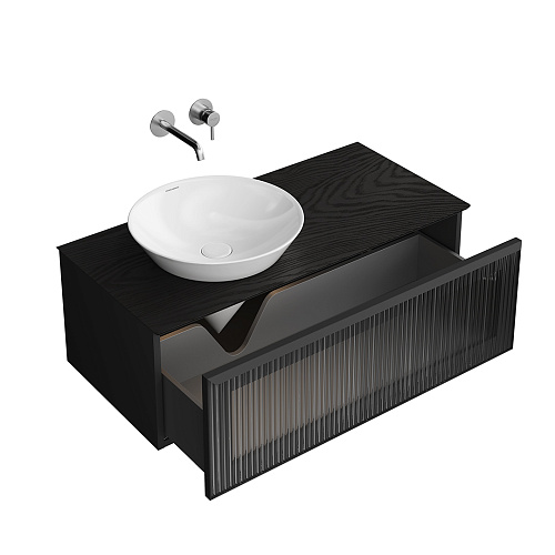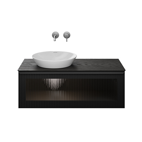 Подвесная мебель с рифлёным стеклом и одним ящиком представлена в ширине 100 см. Корпус выполнен из МДФ, окрашенного в чёрный цвет. Фасад тумбы из рифлёного прозрачного стекла обрамлён чёрным алюминиевым профилем с интегрированной ручкой. Подсветка расположена в верхней части тумбы, по периметру выреза под раковину. Включение и выключение производятся бесконтактным сенсором. Рекомендуемые столешницы: CO3.SG50008220R\100, CO3.KM6012G0291R\100, CO5.SG50008220R\100, CO5.KM6012G0291R\100. В комплектацию входят инструкция по установке тумбы, инструкция по установке сенсора, крепления. Мебель для ванной комнаты KERAMA MARAZZI сочетает в себе стиль, функциональность и высокое качество исполнения. В ассортименте представлены решения для интерьеров любого стиля — от классики до современного минимализма. Особое внимание уделено практичности: каждая тумба под раковину продумана до мелочей, обеспечивая удобное хранение и эстетику. В коллекциях есть как отдельные модули, так и готовые комплекты мебели для ванной, в которые входят тумбы под раковину, зеркала для ванной, а также вместительные пеналы для ванной. Все изделия выполнены из влагостойких материалов, устойчивых к перепадам температуры и влаги. Это идеальное решение для тех, кто ценит комфорт и долговечность.