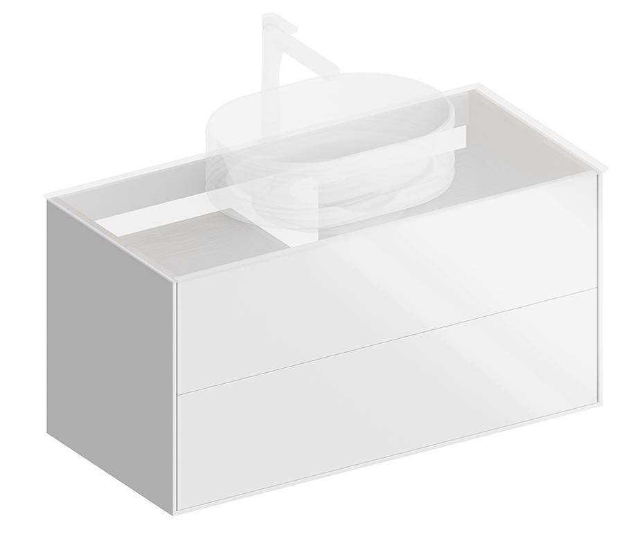 Подвесная тумба в белом глянцевом цвете с двумя выдвижными вместительными ящиками, оснащенными системой открывания Push-to-Open. Сочетается со столешницами PLAZA Modern и накладными раковинами серии PLAZA.