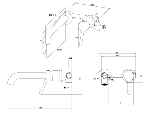 Смеситель представлен в двух цветах – хром и матовый черный. Материалы: внутренняя часть – латунь, излив - нержавеющая сталь. Длина излива – 217 мм.