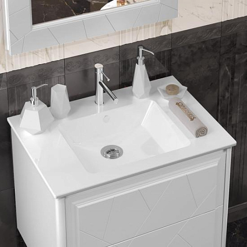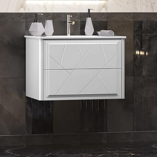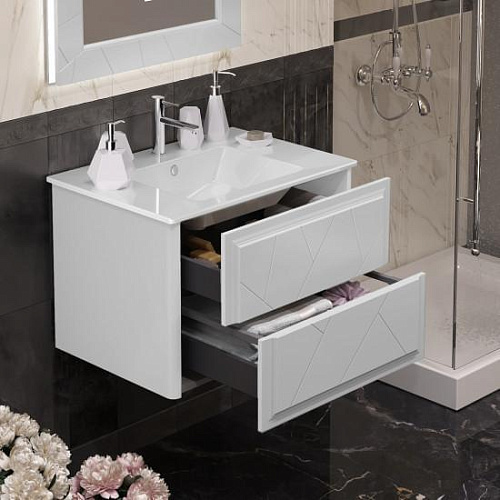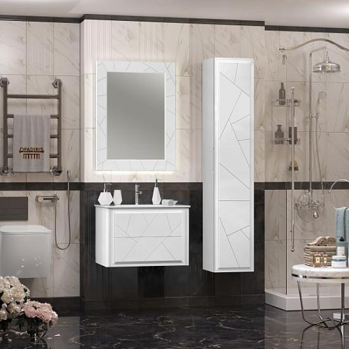 Коллекцию ЛУИДЖИ украшают сложная фрезеровка фасадов строгими линиями и декоративная подсветка по периметру зеркала, которое оснащено сенсорным выключателем. Тумбы дополняются современными ультратонкими керамическими слим-раковинами в размерах 70 см и 90 см. Коллекция изготавливается в цветах Белый матовый и серый матовый. Мебель оснащена механизмами плавного закрывания Hettich (Германия).