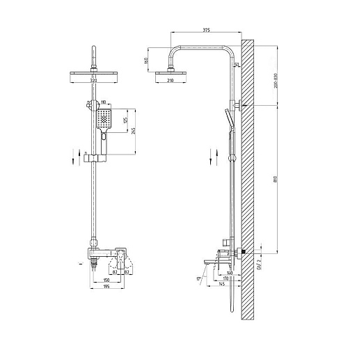 Оснащение Стойка, смеситель, верхний круглый душ, ручной душ, шланг для душа, держатель,