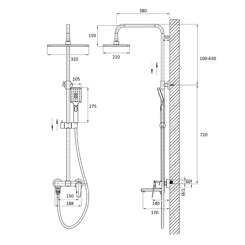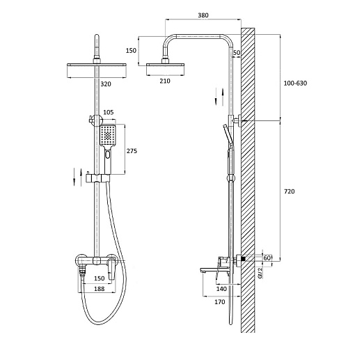Оснащение Стойка 1 шт., крепеж к стене 1 компл., лейка для душа 2 шт., смеситель 1 шт., шланг для душа 1 шт., фиксатор лейки для душа 1 шт., паспорт изделия;лейка 3 режима