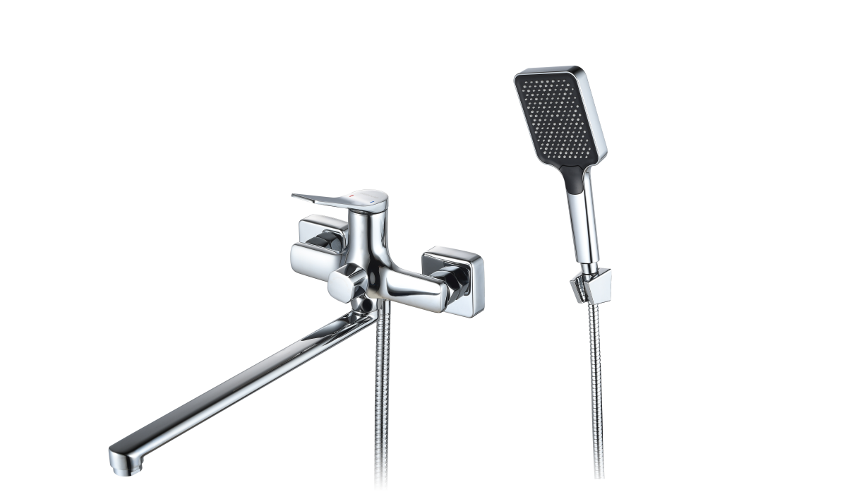 Смеситель для ванны с увеличенной ручкой регулировки потока. Это делает управление изделием простым и удобным. Керамический дивертор. Длина излива 330 мм. Картридж 35 мм. Изделие выполнено из латуни 59 марки. В комплекте шланг 1,5 метра и 3-х режимная лейка. Цвет хром.