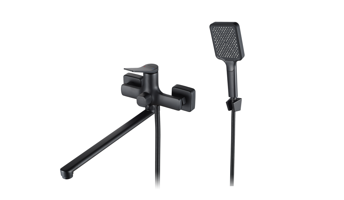 Смеситель для ванны с увеличенной ручкой регулировки потока. Это делает управление изделием простым и удобным. Керамический дивертор. Длина излива 330 мм. Картридж 35 мм. Изделие выполнено из латуни 59 марки. В комплекте шланг 1,5 метра и 3-х режимная лейка. Цвет черный матовый.