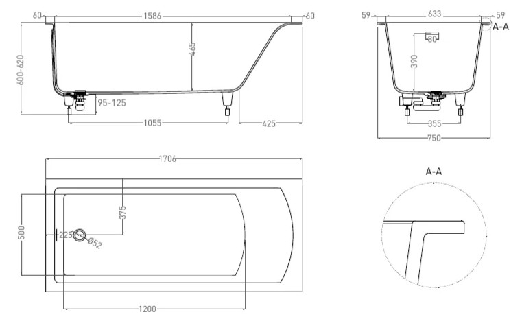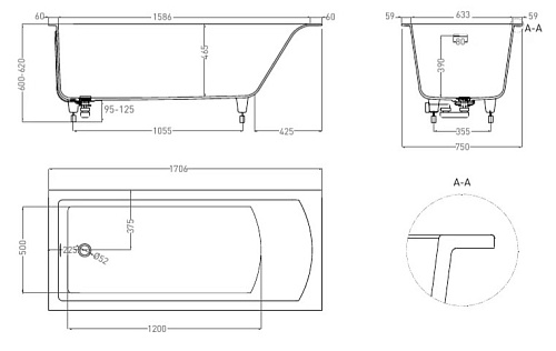 Оснащение ванна, регулируемые ножки до 2 см, интегрированный слив перелив, донный клапан цвет