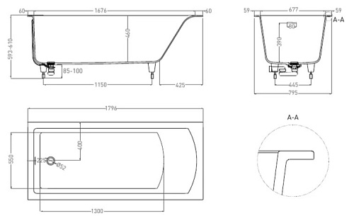 Оснащение ванна, регулируемые ножки до 2 см, интегрированный слив перелив, донный клапан