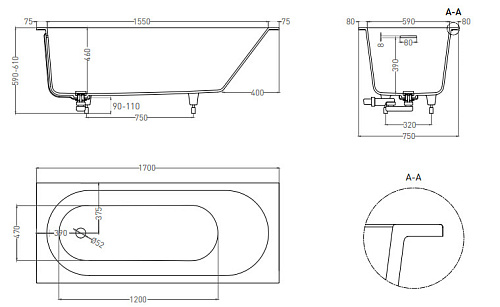Оснащение ванна, интегрированный слив-перелив, сифон, донный клапан Click-clack, регулируемые ножки