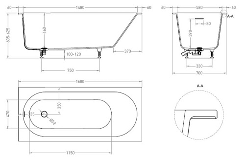 Оснащение ванна, регулируемые ножки до 2 см, интегрированный слив перелив, донный клапан цвет белый