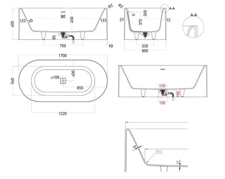 Оснащение ванна, интегрированный слив-перелив, сифон, накладка на сливное отверстие в цвет изделия, донный клапан Click-Clack, ножки (нерегулируемые)