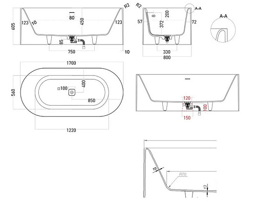 Оснащение ванна, интегрированный слив-перелив, сифон, накладка на сливное отверстие в цвет изделия, донный клапан Click-Clack, ножки (нерегулируемые)