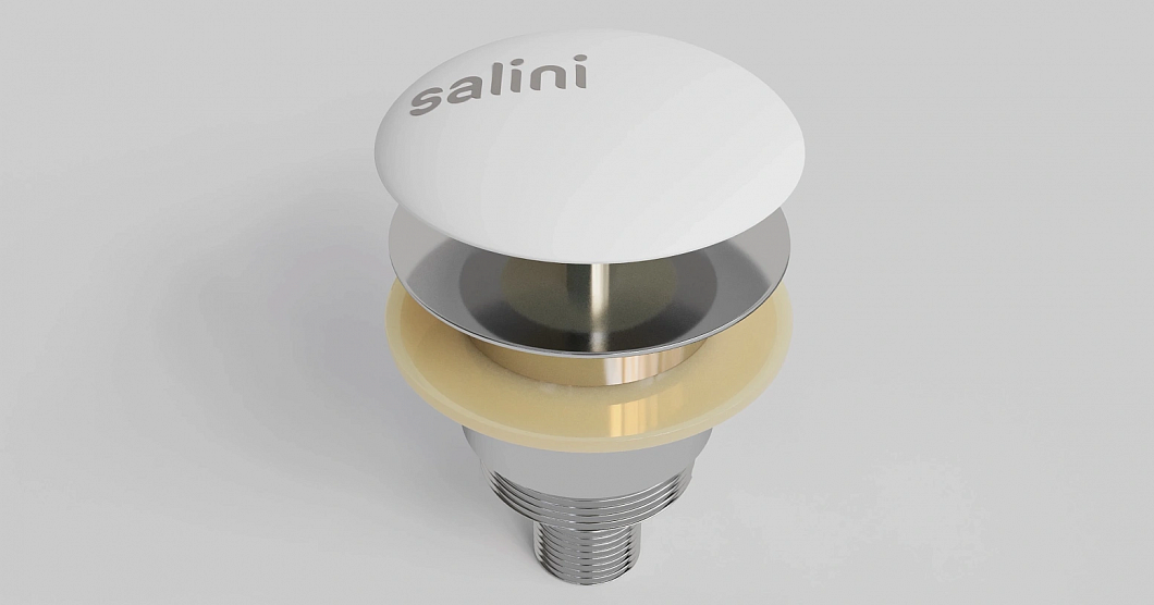 Лаконичный донный клапан модификации Click-Clack. Конструкция изделия спроектирована таким образом, чтобы всего одним нажатием можно было закрыть или открыть сливное отверстие. Это очень удобно и не требует дополнительных усилий. Аккуратная крышка клапана становится естественным продолжением дна, не слишком выделяясь на фоне всей ванны или раковины. Она может быть выполнена как из материала S-Stone, так и материала S-Sense с матовой или глянцевой поверхностью. Донный клапан окрашивается в цвет основного изделия по палитре RAL Classic. При желании можно воспользоваться дополнительной услугой по изготовлению однотонного клапана без логотипа Salini.