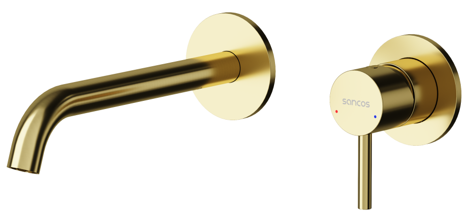 Встраиваемый в стену смеситель для раковины с внутренней частью из латуни; Точная регулировка температуры и напора воды с используемыми картриджами SEDAL (Испания); Мягкий поток воды без разбрызгивания за счёт силиконовых аэраторов Neoperl®; Экстра прочное покрытие методом PVD; Цвет брашированное золото