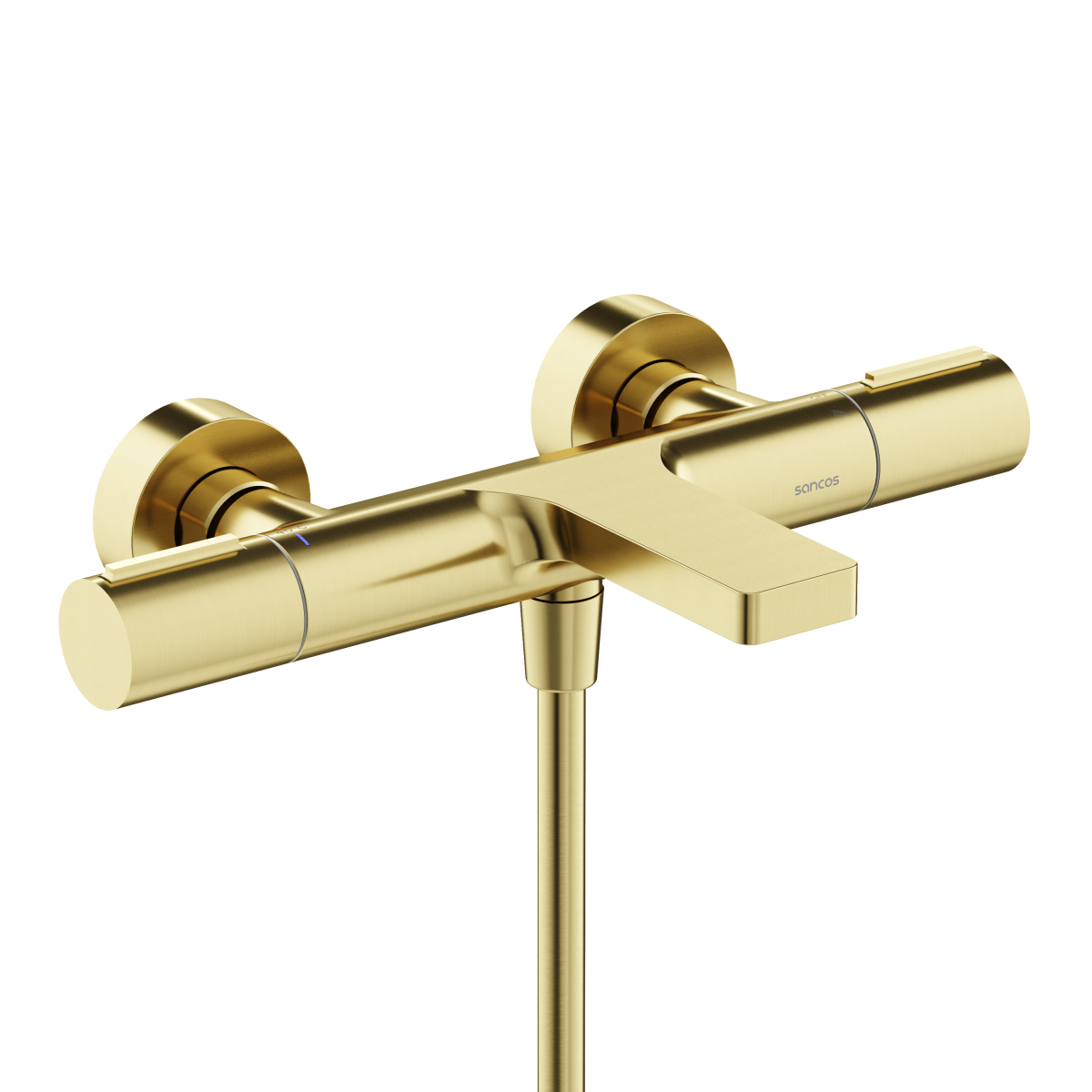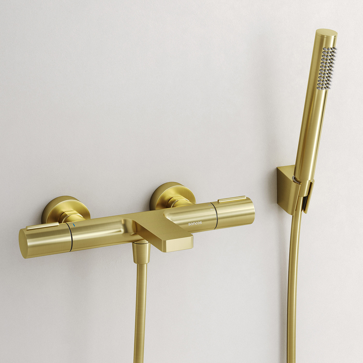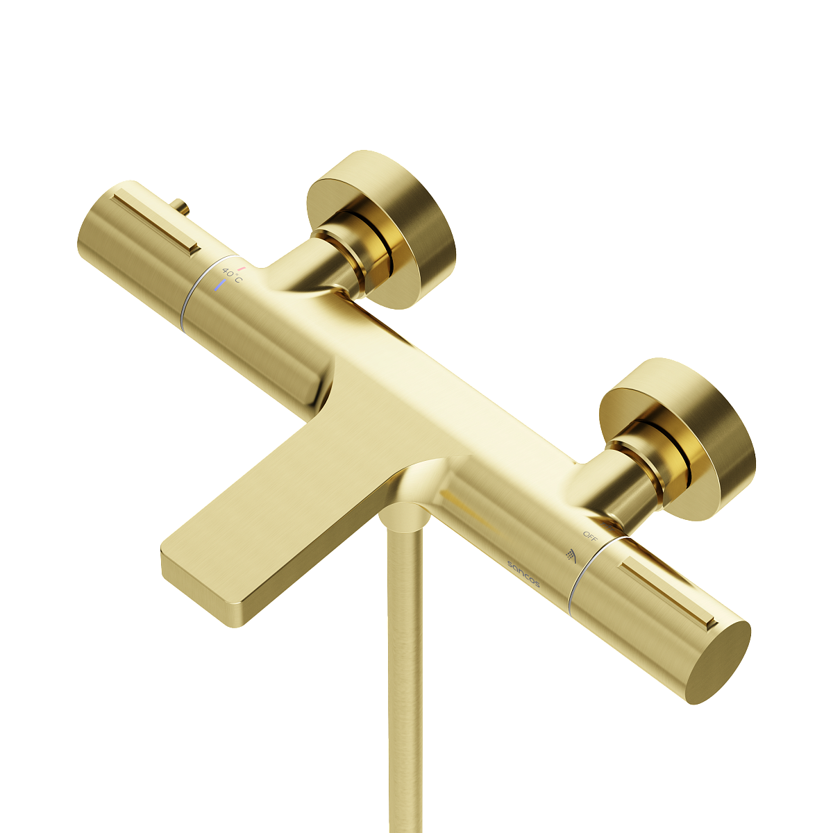 Смеситель для ванны и душа с термостатом; Корпус выполнен из прочной латуни; Фиксированный излив; Высокочувствительный катридж SEDAL (Испания) позволитмгновенно настроить желаемую температуру воды; Мягкий поток воды без разбрызгивания за счёт силиконовых аэраторов Neoperl®;Предустановленный ограничитель температуры при 40°; Система защиты от ожогов при отключении холодной воды; Встроенный дивертер для переключения между источниками воды; Встроенный клапан защиты от обратного потока; Цвет брашированное золото