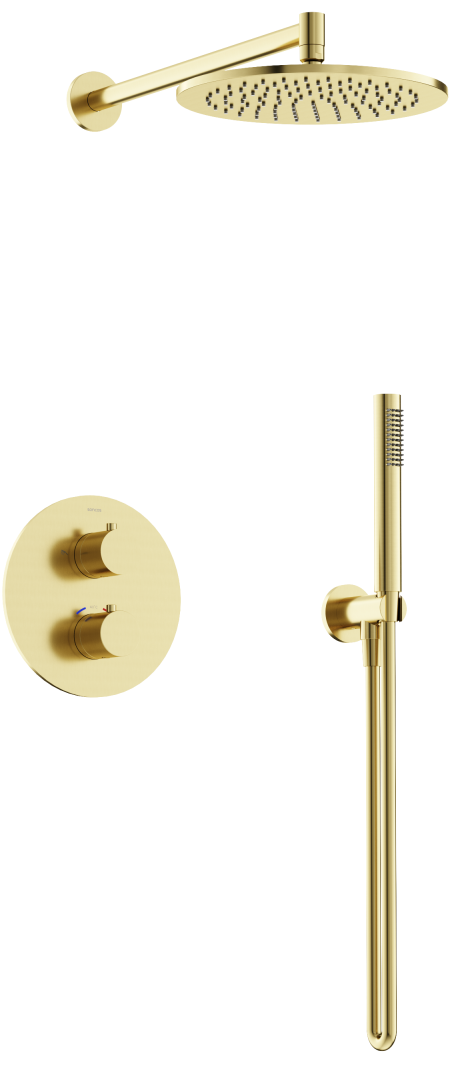 Смеситель со встроенным термостатом; Надежный корпус из высококачественной латуни; Термостатический картридж SEDAL (Испания) - обеспечивает точную настройку заданной температуры; Встроенный девиатор SEDAL (ИСпания) автоматически переклюключает поток с верхнего душа на ручной при выключении воды. Ручной душ из латуни; Шланг ПВХ с системой защиты от перекручивания, длина 1,5 м; Верхний душ из нержавеюшей стали , Ø250 мм, с возможностью регулировки угла наклона; прочное покртытие методом электроплейтинга; цвет матовый черный ; экстрапрочное PVD покрытие; Цвет брашированное золото