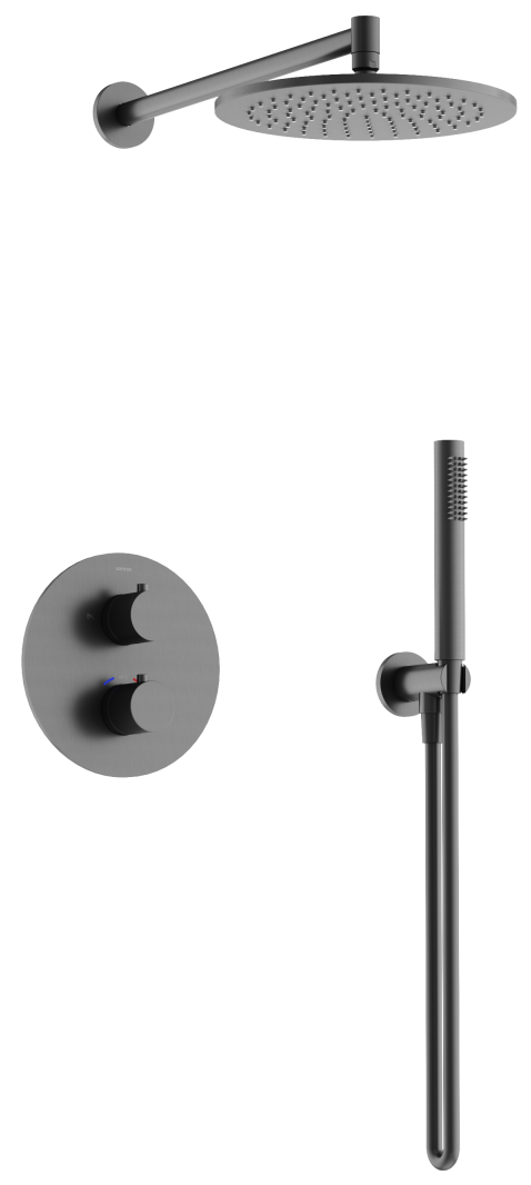 Смеситель со встроенным термостатом; Надежный корпус из высококачественной латуни; Термостатический картридж SEDAL (Испания) - обеспечивает точную настройку заданной температуры; Встроенный девиатор SEDAL (ИСпания) автоматически переклюключает поток с верхнего душа на ручной при выключении воды. Ручной душ из латуни; Шланг ПВХ с системой защиты от перекручивания, длина 1,5 м; Верхний душ из нержавеюшей стали , Ø250 мм, с возможностью регулировки угла наклона; прочное покртытие методом электроплейтинга; цвет матовый черный ; экстрапрочное PVD покрытие; Цвет вороненая сталь