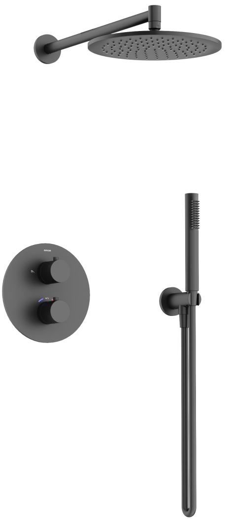 Смеситель со встроенным термостатом; Надежный корпус из высококачественной латуни; Термостатический картридж SEDAL (Испания) - обеспечивает точную настройку заданной температуры; Встроенный девиатор SEDAL (ИСпания) автоматически переклюключает поток с верхнего душа на ручной при выключении воды. Ручной душ из латуни; Шланг ПВХ с системой защиты от перекручивания, длина 1,5 м; Верхний душ из нержавеюшей стали , Ø250 мм, с возможностью регулировки угла наклона; прочное покртытие методом электроплейтинга; цвет матовый черный