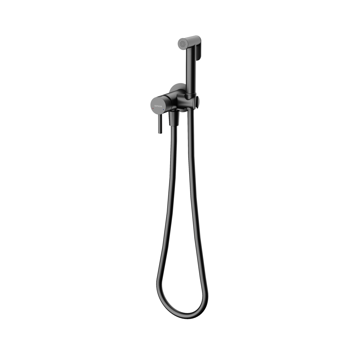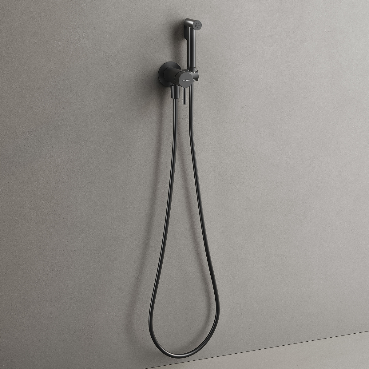 Гигиенический душ со смесителем скрытого монтажа. Материал корпуса- латунь; материал ручного душа - латунь;Шланг с защитой от перекручивания , 1,5 м. Прочное покрытие методом электроплейтинга; Цвет черный матовый