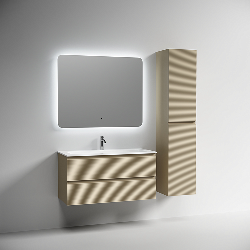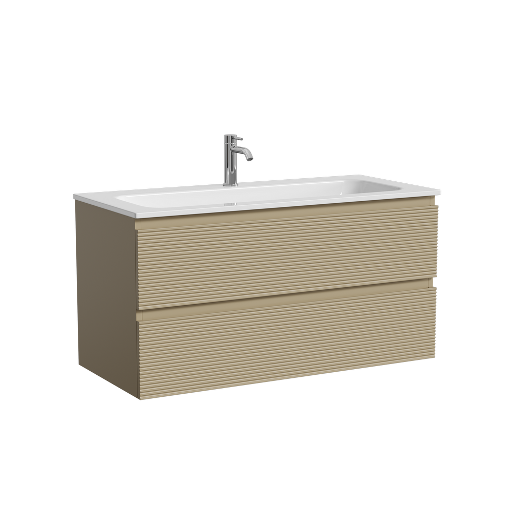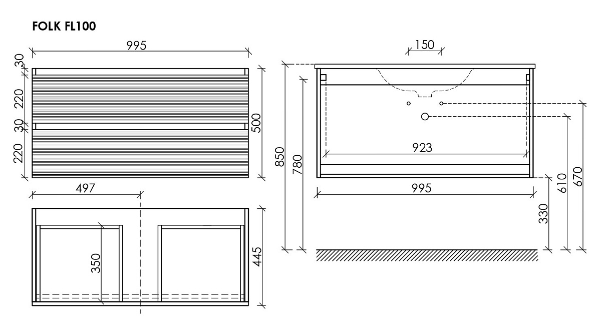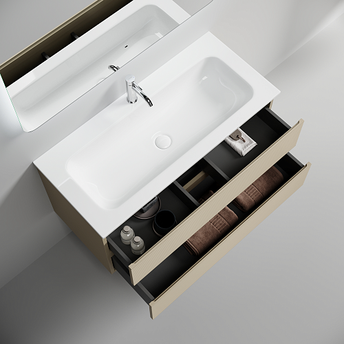 Тумба подвесная с двумя выдвижными ящиками с доводчиками скрытого монтажа Каркас и фасад тумбы выполнен из МДФ, покрытие ПВХ - пленка Размер 995х445х500 На изображении тумба Folk представлена с зеркалом RAY, смесителем из коллекции ETNA и раковинами Grace CN7013