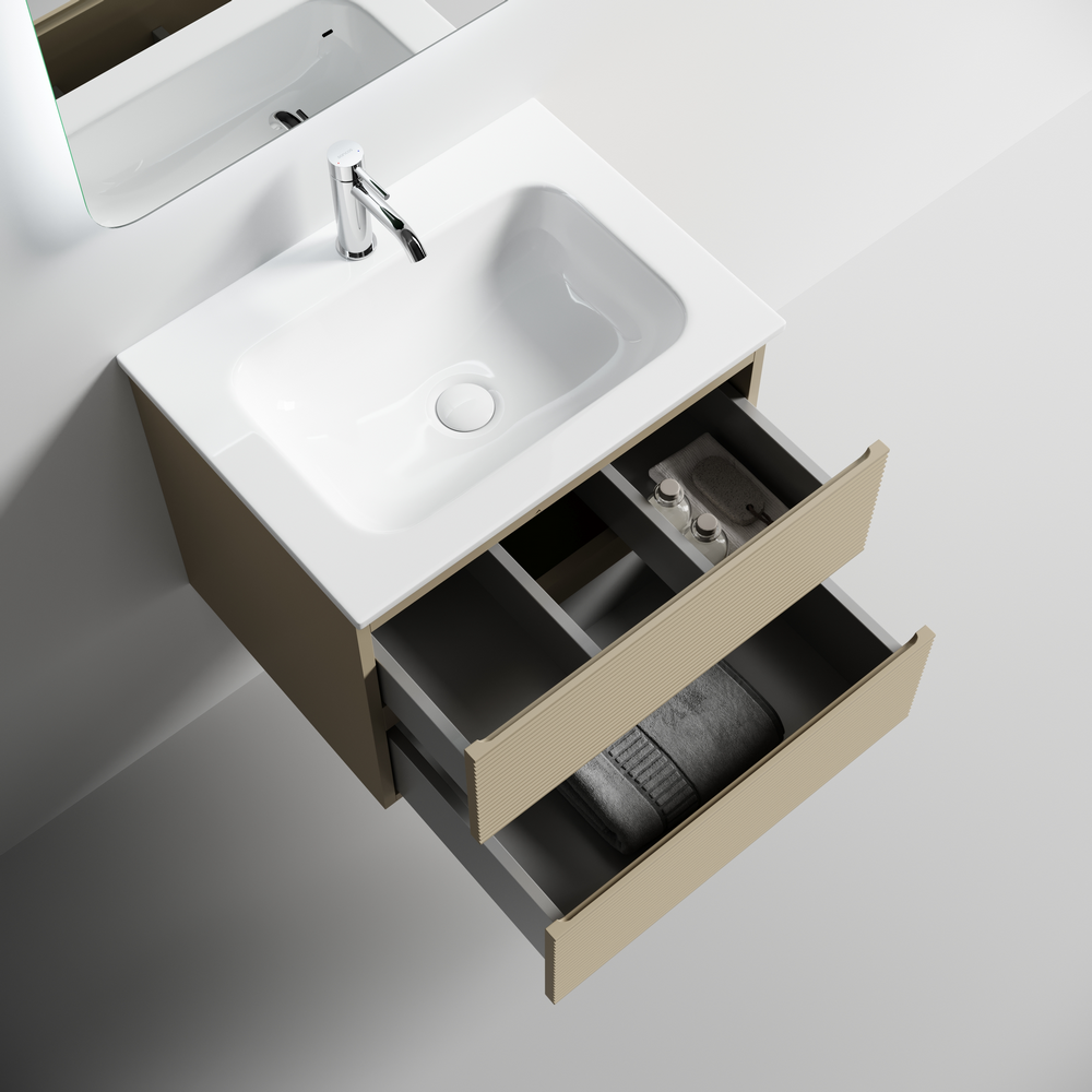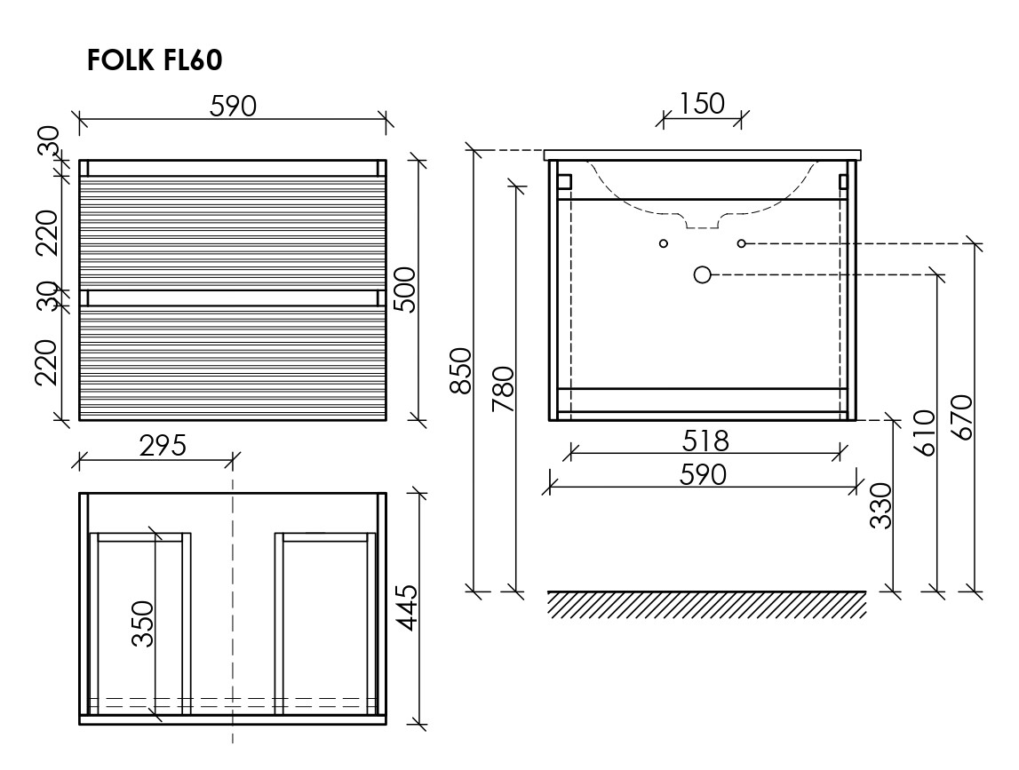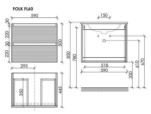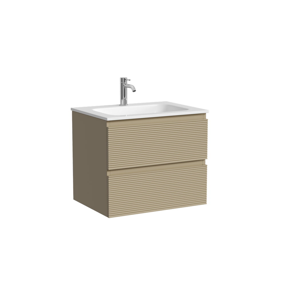 Тумба подвесная с двумя выдвижными ящиками с доводчиками скрытого монтажа Каркас и фасад тумбы выполнен из МДФ, покрытие ПВХ - пленка Размер 590х445х500 На изображении тумба Folk представлена с зеркалом RAY, смесителем из коллекции ETNA и раковинами Grace CN7011