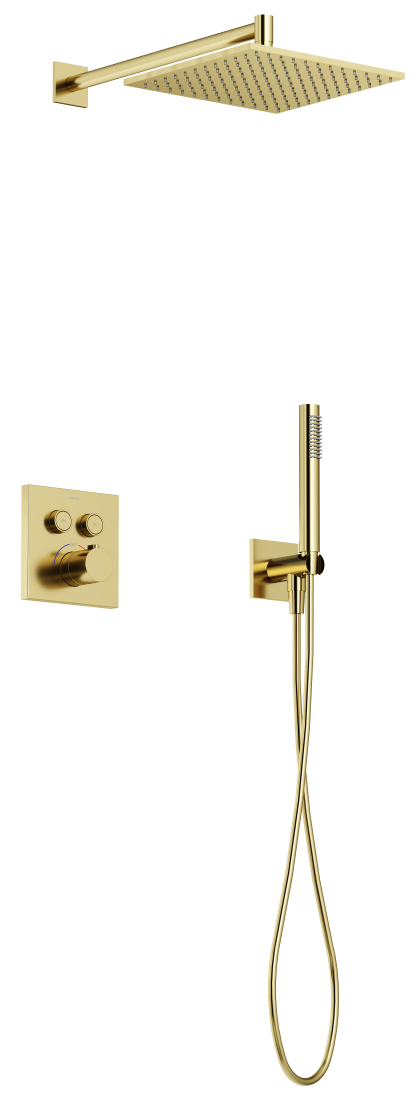 Смеситель со встроенным термостатом; Надежный корпус из высококачественной латуни; Термостатический картридж SEDAL (Испания) - обеспечивает точную настройку заданной температуры; Встроенный девиатор автоматически переклюключает поток с верхнего душа на ручной при выключении воды. Ручной душ из латуни со шлангом из ПВХ с системой защиты от перекручивания, длина 1,5 м. Верхний душ из нержавеюшей стали; Верхний душ 250x250 с возможностью регулировки угла наклона; экстрапрочное PVD покрытие; цвет брашированное золото